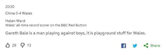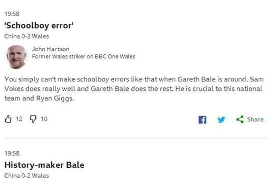 BBC也对威尔士队和国足的交手进行了点评,前威尔士队前锋哈特森谈到了中国队的第二个失球,他表示:“你肯定不能够犯下像校队球员一样的失误,特别是你面对的对手可是加雷斯-贝尔,沃克斯抢下了皮球,然后贝尔接管了剩余的工作,对于威尔士队和吉格斯而言,贝尔就是球队最为关键的那个人。” 威尔士女足射手王海伦-沃尔德表示:“贝尔看起来就像是大人和一群小孩在踢球,威尔士队就像在操场上踢球那样放松自在。”