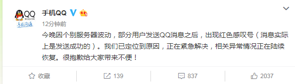 手机QQ方面回复称,今晚因个别服务器波动,部分用户发送QQ消息之后,出现红色感叹号(消息实际上是发送成功的)。已定位到原因,正在紧急解决,相关异常情况正在陆续恢复。